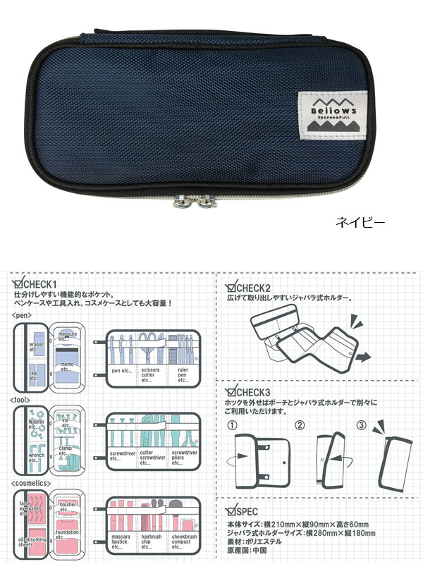 ○材質:ポリエステル ○本体サイズ:約横210×縦90×高さ60mm ○ジャバラ式ホルダーサイズ:約横280×縦180×高さ60mm ○使用上の注意:洗濯はできません。摩擦や水に濡れた場合、色落ちすることがありますので、取り扱いにはお気をつけください。
